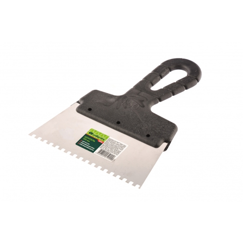 Полотно шпателя изготовлено из нержавеющей стали. Рабочая поверхность инструмента имеет квадратные зубья. Облегченная ручка из ударопрочной пластмассы. Ручка шпателя имеет специальную изогнутую форму, что обеспечивает максимально удобную работу. Шпатели с прямоугольными зубьями применяются для разравнивания клеевых растворов с последующей укладкой облицовочного материала: керамическая плитка, натуральный камень и др.