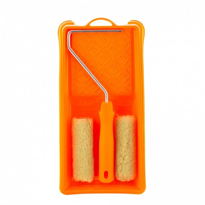 Шубка с ворсом 12 мм обеспечивает среднюю толщину слоя при покраске. Ручка валика имеет эргономичную форму. Кювета изготовлена из высококачественной пластмассы. Благодаря конструкции излишки краски не задерживаются на раскаточной доске, а стекают в ванночку.
