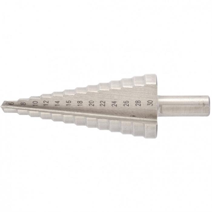 Каждый следующий размер имеет плавный переход в виде ступеньки, что позволяет получать аккуратное отверстие нужного диаметра.