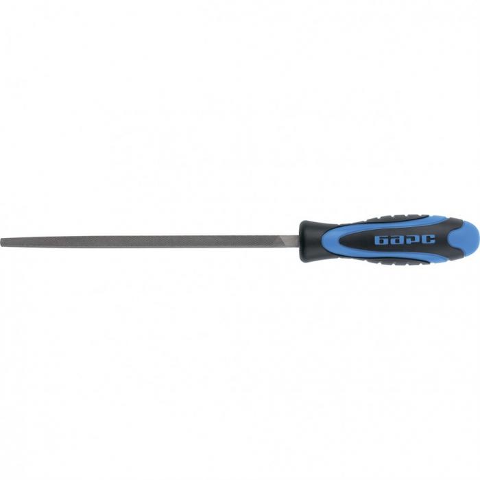 Напильник изготовлен из высокоуглеродистой инструментальной стали У13А, имеет перекрестную насечку №2, твердость 58-62 HRC. Двухкомпонентная рукоятка обеспечивает комфортный хват при работе. Напильник предназначен для опиливания изделий из металла.