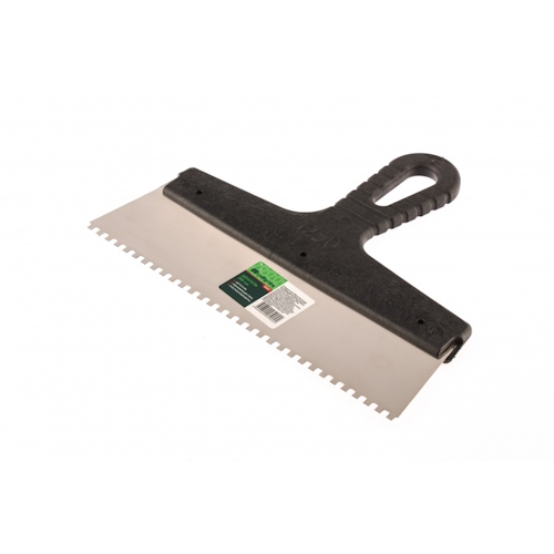 Полотно шпателя изготовлено из нержавеющей стали. Рабочая поверхность инструмента имеет квадратные зубья. Облегченная ручка из ударопрочной пластмассы. Ручка шпателя имеет специальную изогнутую форму, что обеспечивает максимально удобную работу. Шпатели с прямоугольными зубьями применяются для разравнивания клеевых растворов с последующей укладкой облицовочного материала: керамическая плитка, нату...