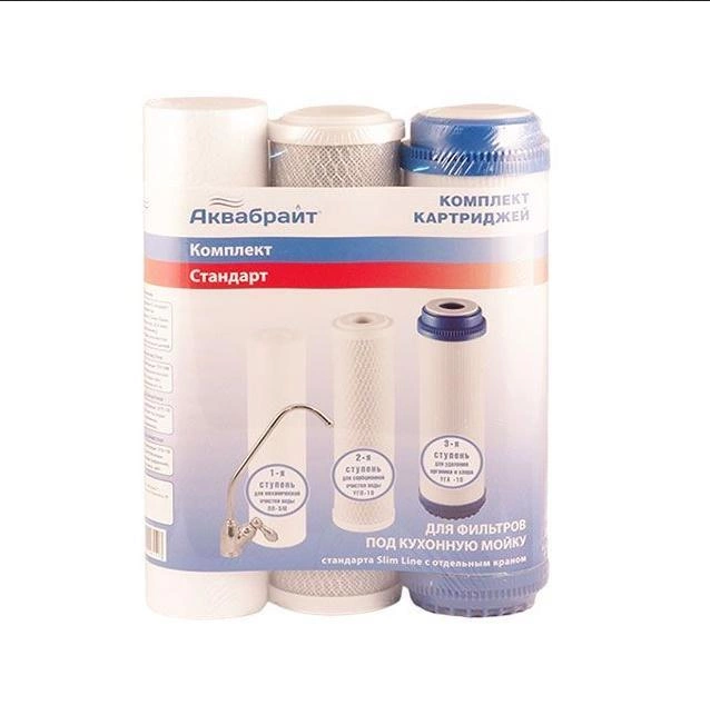 Комплект картриджей Стандарт устанавливается в фильтры стандарта 10 SL Слим Лайн (высота колбы фильтра 254 мм) под кухонную мойку и предназначен для доочистки питьевой воды для личных целей. Подходит для тройных фильтров подобного стандарта всех производителей - таких как Аквафор Трио Норма, Гейзер 3И и других. 1-я ступень очистки используемый картридж ПП-5М Очистка воды от механических загрязнени...