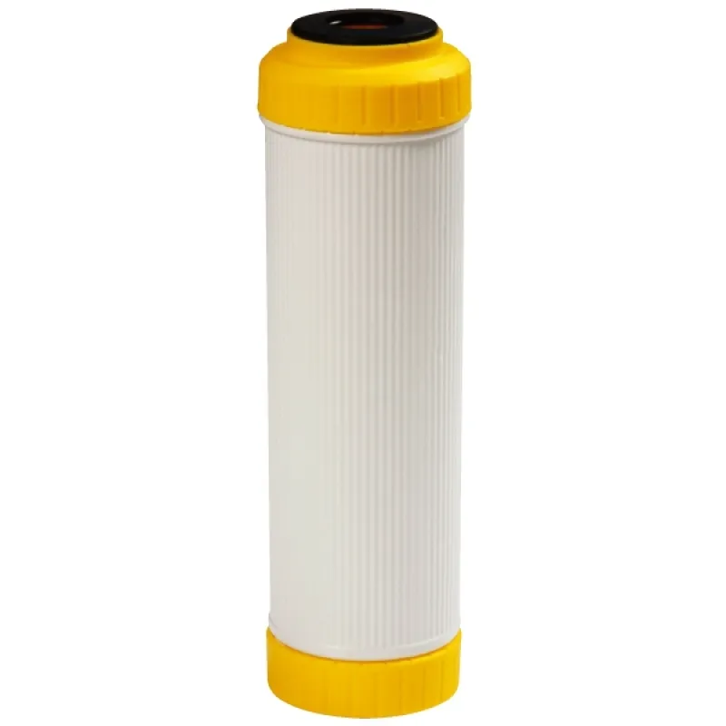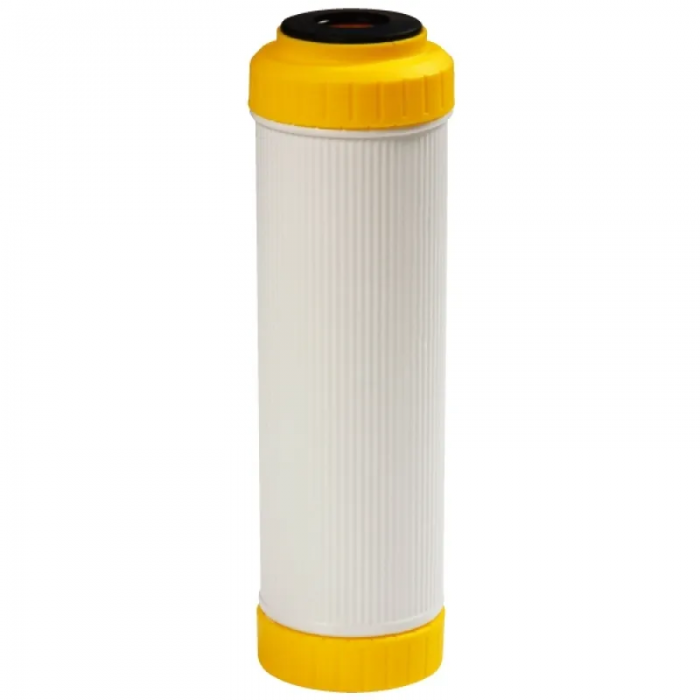 Картридж заполнен специальной пищевой ионообменной смолой, удаляющей соли жесткости из воды. Конструкция картриджа обеспечивает максимальное время контакта воды, предотвращая образование накипи (соединения солей жесткости) на нагревательных элементах бытовых приборов. Устраняет горьковатый привкус чая и маслянистую пленку на его поверхности. Необходима регенерация солевым раствором каждые 150 литров.