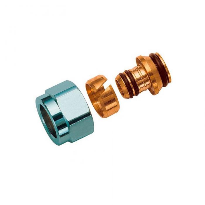 Предназначен для создания разъемного соединения трубы из металлопластика и трубы PEX 16х2 мм с запорно-распределительной арматурой, имеющей посадочное место «под евроконус». Концовка включает в себя адаптер, обжимное кольцо и хромированную накидную гайку.