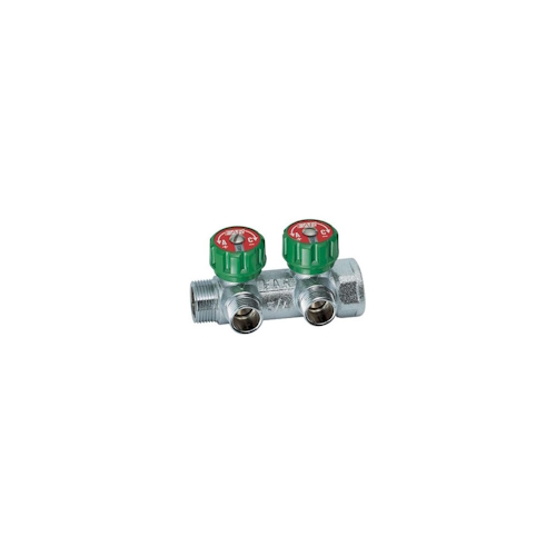 Регулирующий коллектор FAR 3/4" ВР-НР с 2 отв. 1/2" НР межосев. 45 мм, плск.упл. FK 3821 3412TP применяется в системе отопления для распределения и настройки работы отдельных контуров. Изделие изготовлено из латуни, имеет два регулировочных вентиля.