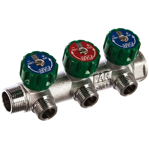 Регулирующий коллектор FAR 3/4" ВР-НР с 3 отв. 1/2" НР межосев. 45 мм, плск.упл FK 3822 3412TP - коллекторная гребенка на три контура. Изделие рассчитано на эксплуатацию как в системе отопления, так и в системе водоснабжения. Позволяет регулировать интенсивность потока рабочей среды.