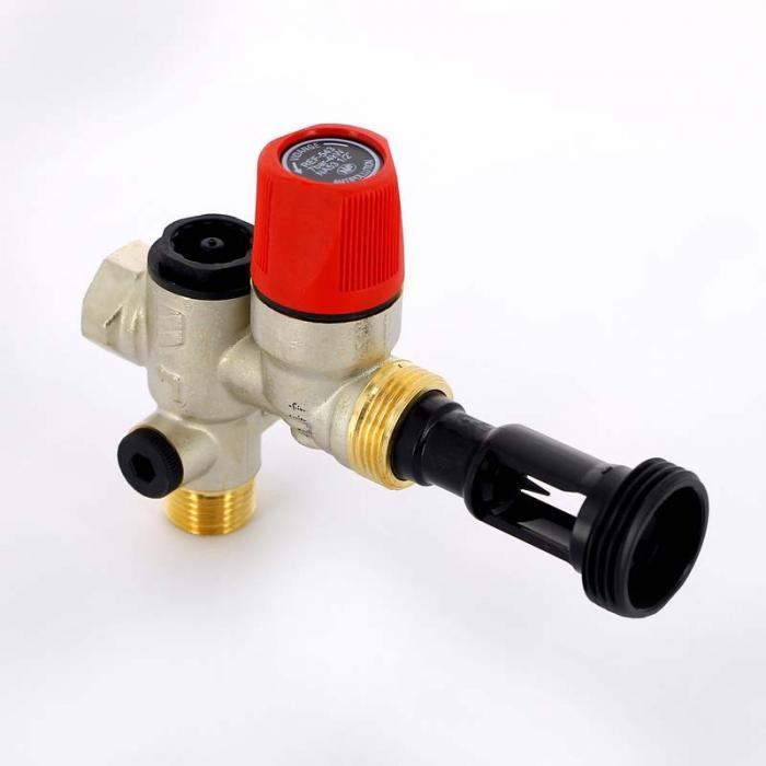 Для водогревателей (теплоаккумуляторов) малого объема (от 10 до 50 л). Присоединительный штуцер G1/2" (15 x 21). Обычно монтируется над раковиной или ниже уровня раковины (под сливной арматурой). Корпус – латунь, мембрана – EPDM. Макс. рабочее давление 10 бар. Температура воды до 120°C. Порог срабатывания предохранительного клапана 7 бар. Макс. теплопроизводительность водонагревателя (1/2") 4 кВт.