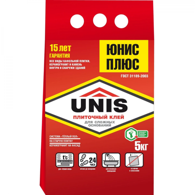 Клей для плитки Unis Плюс – универсальный клеевой состав для укладки любых видов керамической плитки, клинкерной плитки, плит из природного и искусственного камня и керамогранита малого и среднего формата на стены, а также керамогранита формата до 60х120 см на полы в любых помещениях: влажных, сухих, промерзающих и отапливаемых. Клей также подходит для наружных работ, облицовки фасадов и цоколей з...
